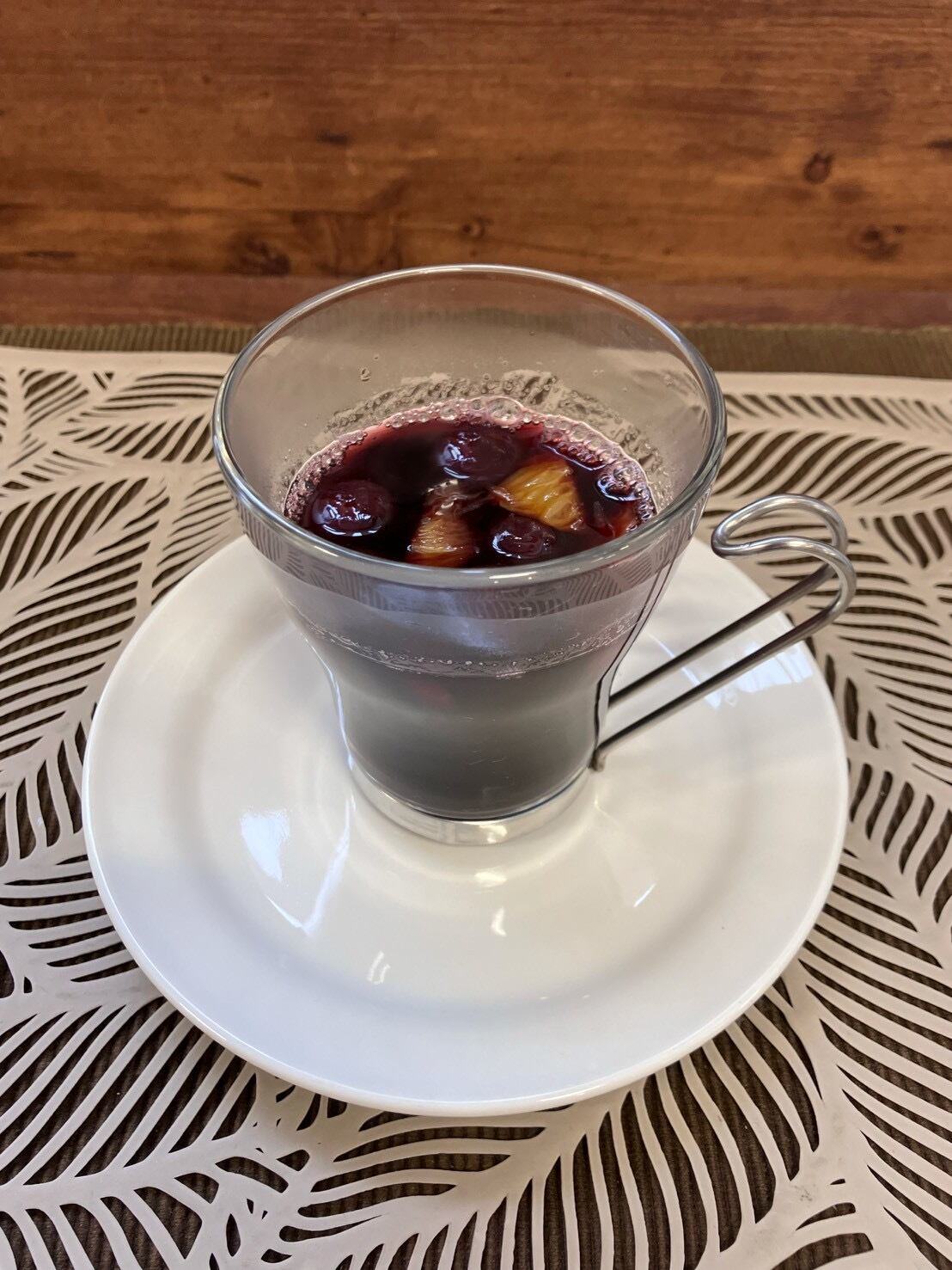 このホットサングリアは、ぶどうジュースベースのノンアルコールドリンクで、果実の甘みとスパイスの香りが重なる上品な味わいが特徴です。寒い冬のひとときにぴったりな、心が温まる飲み物です。デザート感覚で楽しむこともでき、特別な日のディナーやリラックスタイムにもおすすめです。心を込めてお届けしますので、ぜひあなたのお食事の時間に取り入れてみてください!